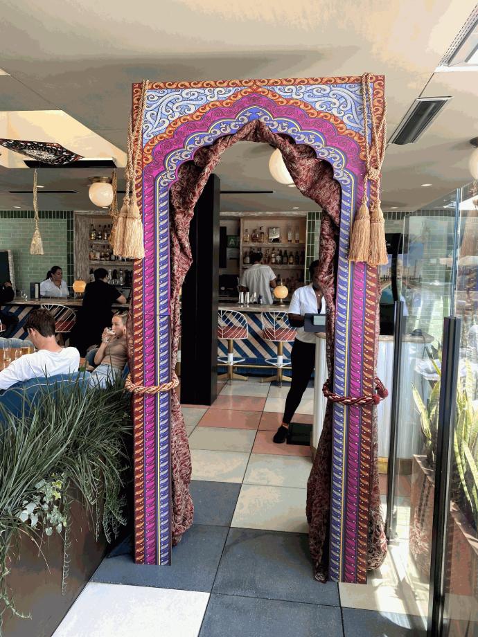 Something similar happened with the mirrors hanging on the walls of the restaurant. Their shape vaguely resembles the arches often found in the traditional architecture of countries like Morocco or Tunisia. However, with the addition of colorful gatorboard frames they become an unmistakable homage to the art of Middle Eastern ornamentation.