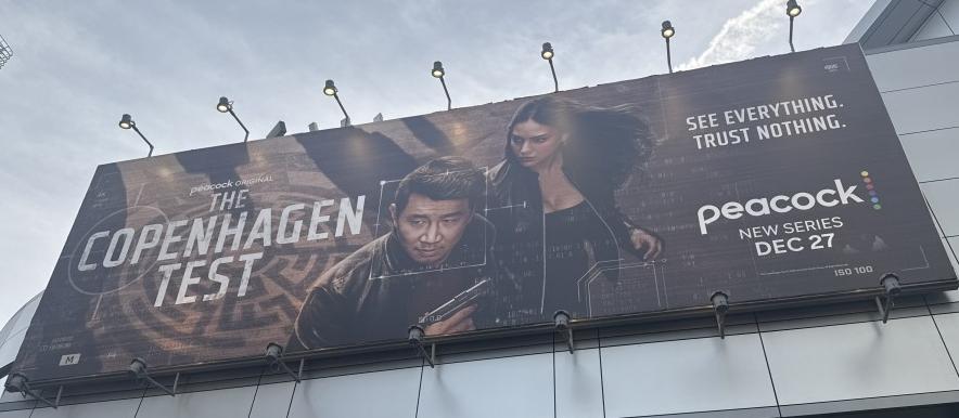 If you walked through LA LIVE recently, you couldn't miss the visual impact of the ad. The exterior of the building was covered in massive banners for Peacock’s new original series The Copenhagen Test. The large banners sit high above the plaza, stretching across multiple sections of the building.
