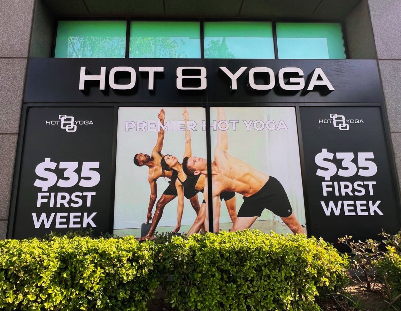For Hot 8 Yoga’s window graphics, the promotional message sits at the center panel and anchors the entire storefront. The typography uses strong contrast so the message stays readable even when viewed from across the parking lot.