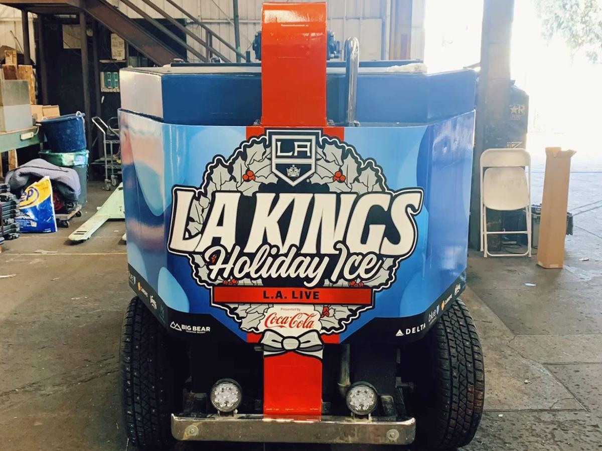 The imagery centered on LA Kings Holiday Ice branding, with bold graphics, winter themed color, and strong contrast that stays legible in motion. The logo placement was carefully planned so it never feels cut off or distorted by panel seams. Even when the Zamboni is moving, the branding reads clean and intentional.