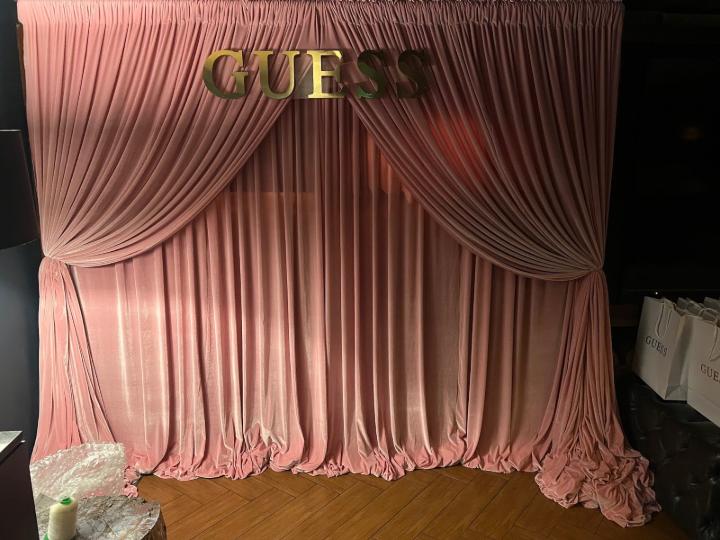 A completely different project came from GUESS. They wanted something that felt elegant, feminine, and a little dramatic. Instead of a traditional printed wall, the backdrop used soft pink drape panels supported by a hidden structure, with the GUESS name floating above in metallic lettering. The printed pieces handled the structural elements and color matching, while the fabric did the rest. Once the room lighting hit it, the folds created shadow and depth that photographed beautifully. Guests didn’t just take a quick picture. They lingered. They adjusted the drapes. They treated it like a stage.